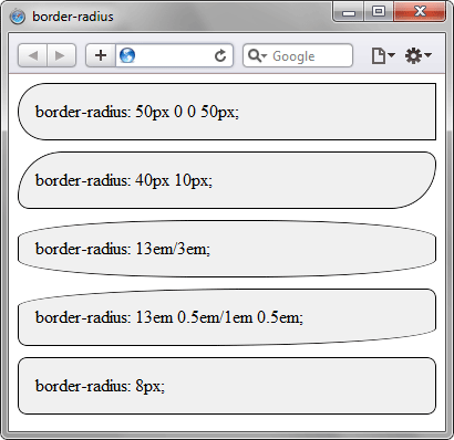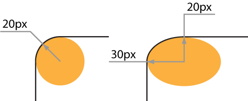 В случае задания двух параметров через слэш, то первый задает радиус по горизонтали, а второй по вертикали (эллиптические уголки). На рис. 1 показана разница между обычным скругленным уголком и эллиптическим уголком.