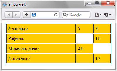 Задает отображение границ и фона в ячейке, если она пустая. При одновременном добавлении к таблице свойства border-collapse со значением collapse, свойство empty-cells игнорируется.