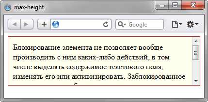 Устанавливает максимальную высоту элемента. Значение высоты элемента будет вычисляться в зависимости от значений установленных свойств height, max-height и min-height. В табл. 1 показано, чем руководствуется браузер при совместном использовании указанных стилевых свойств.