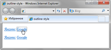 Результат примера показан на рис. 2. В данном примере для браузера IE8 убирается пунктирная граница вокруг ссылок, возникающая при их активации. В первом абзаце рамка еще будет отображаться, а во втором абзаце она скрывается с помощью значения none свойства outline-style.