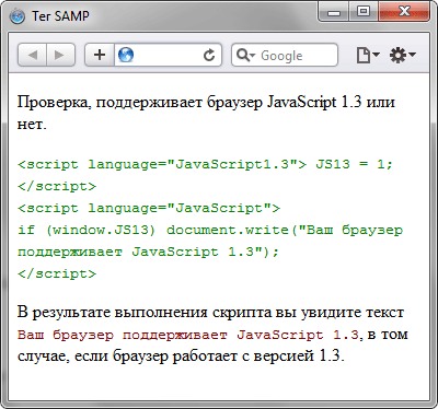 <p>Проверка, поддерживает браузер JavaScript 1.3 или нет.</p>