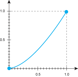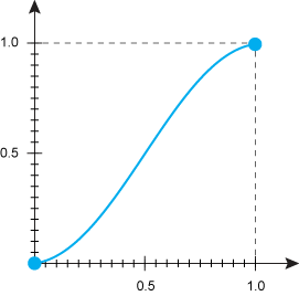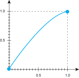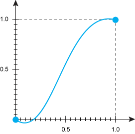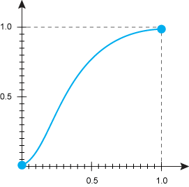transition-timing-function представляет собой математическую функцию, показывающую, как быстро по времени меняется указанное через transition-property значение свойства. Начальная точка имеет координаты 0.0, 0.0, конечная — 1.0, 1.0, при этом функция по оси ординат может превышать эти значения в большую или меньшую сторону (рис. 1).